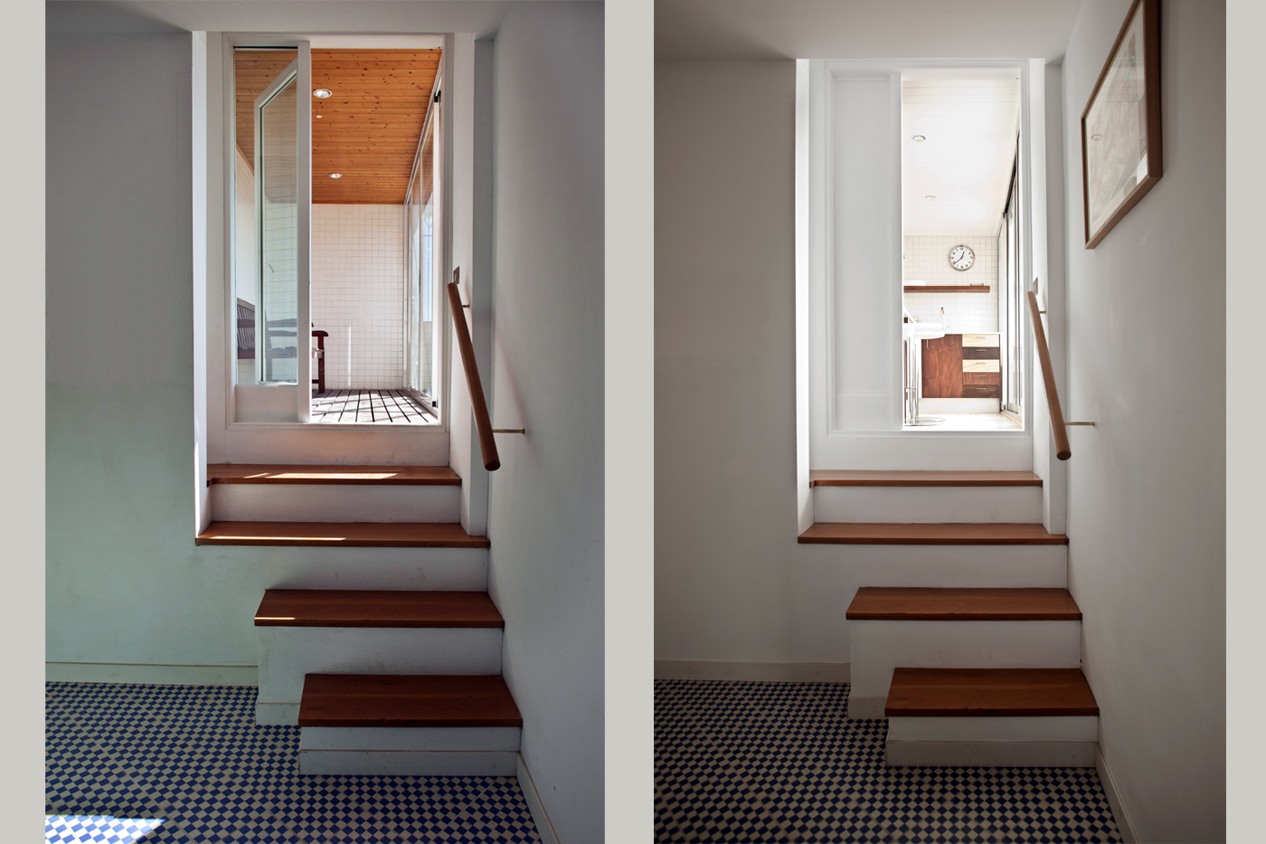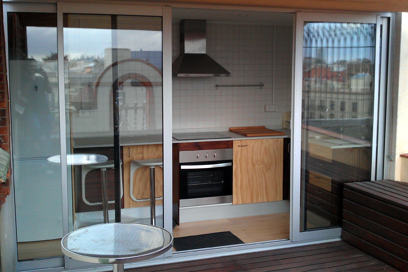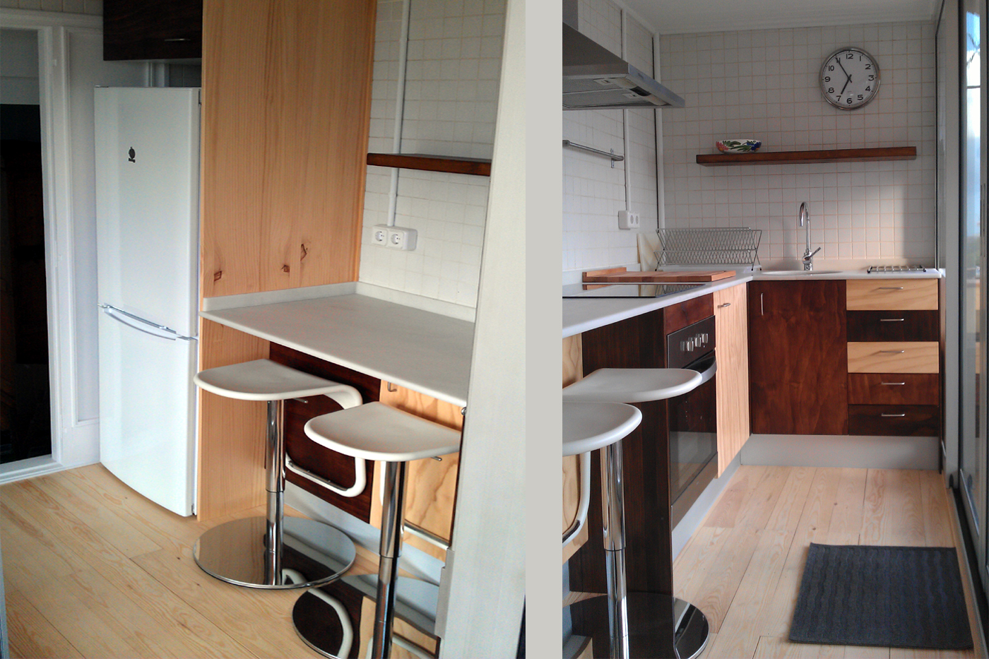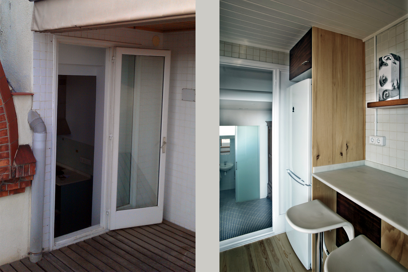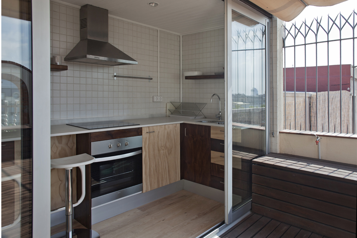 Situada en la misma cúpula modernista que el altillo, ésta vez nos encargaron redistribuir la zona de cocina y recibidor, ampliando el baño existente; para ello decidimos trasladar la cocina a la parte superior de la vivienda, situándola a pie de una de las dos magníficas terrazas de las que consta, liberando espacio para el baño y el recibidor. Diseñamos una cocina sencilla, sin grandes alardes, pero creemos que con una decoración y funcionalidad únicas. Dispusimos una pequeña zona de barra con taburetes para ese almuerzo o cena rápida, así como la espléndida posibilidad de cenar en la terraza sin tener que desplazarse.