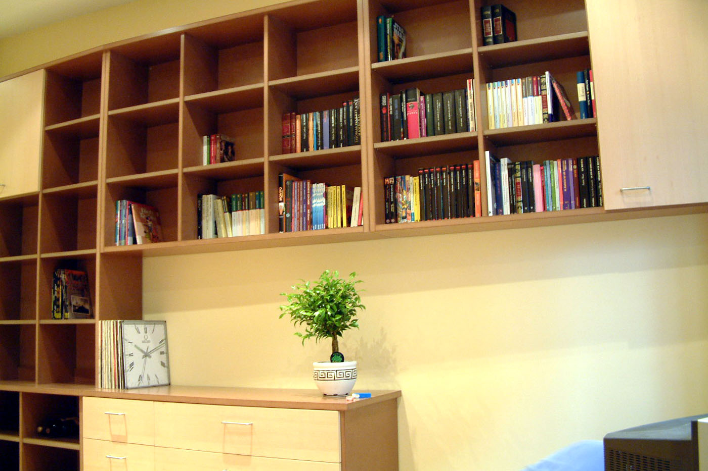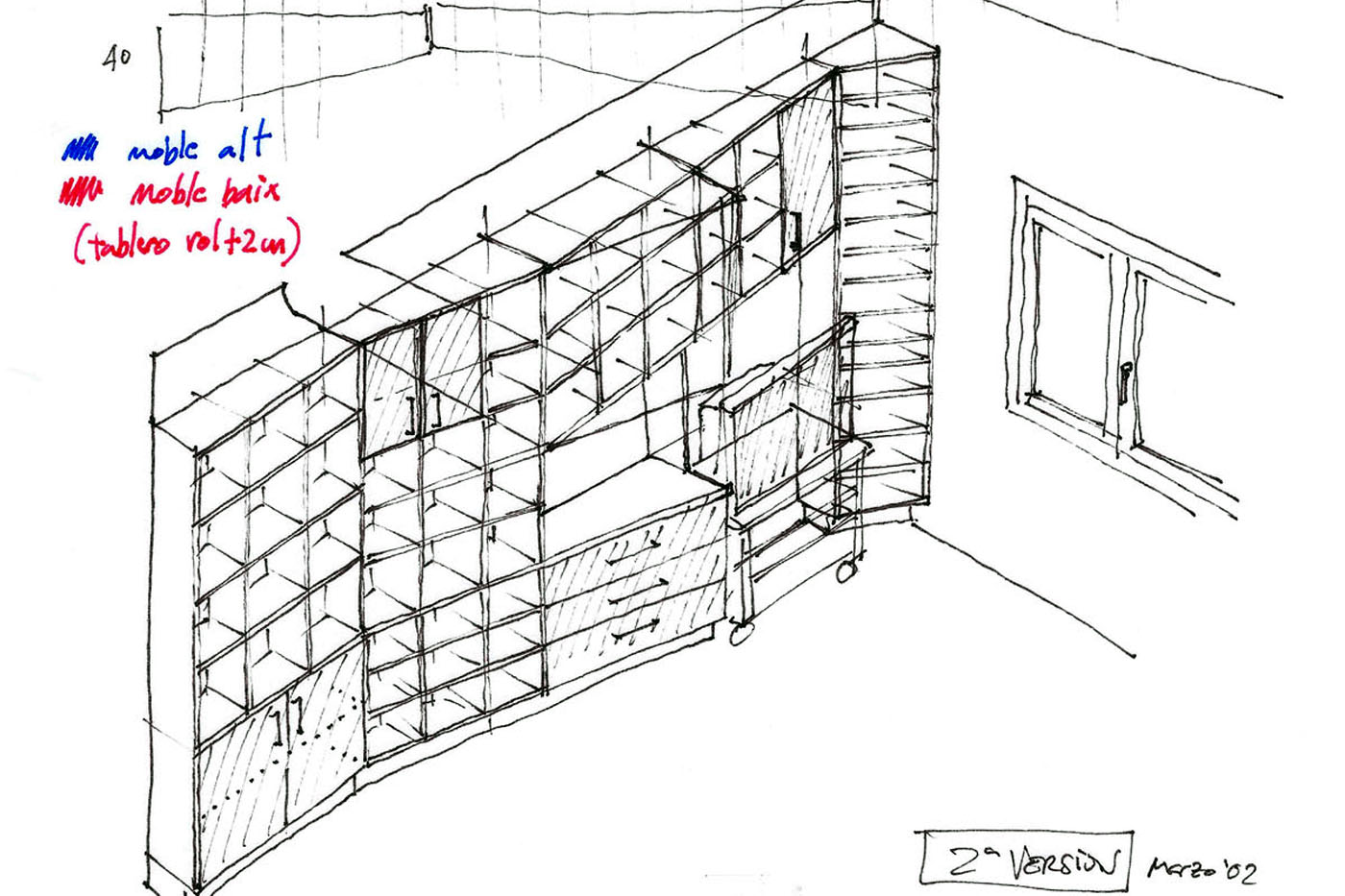 Uno de nuestros primeros trabajos, una singular y heterodoxa librería en zig-zag, compuesta de varios módulos asimétricos y de forma trapezoidal que se unen y se separan para dar una apariencia no lineal de las estanterías. Realizada en tablero de partículas (DM) barnizado y puertas en chapa de Maple natural también barnizadas. Con unas medidas de casi 6 metros de largo por 3 metros de alto es sin duda una pieza imponente.