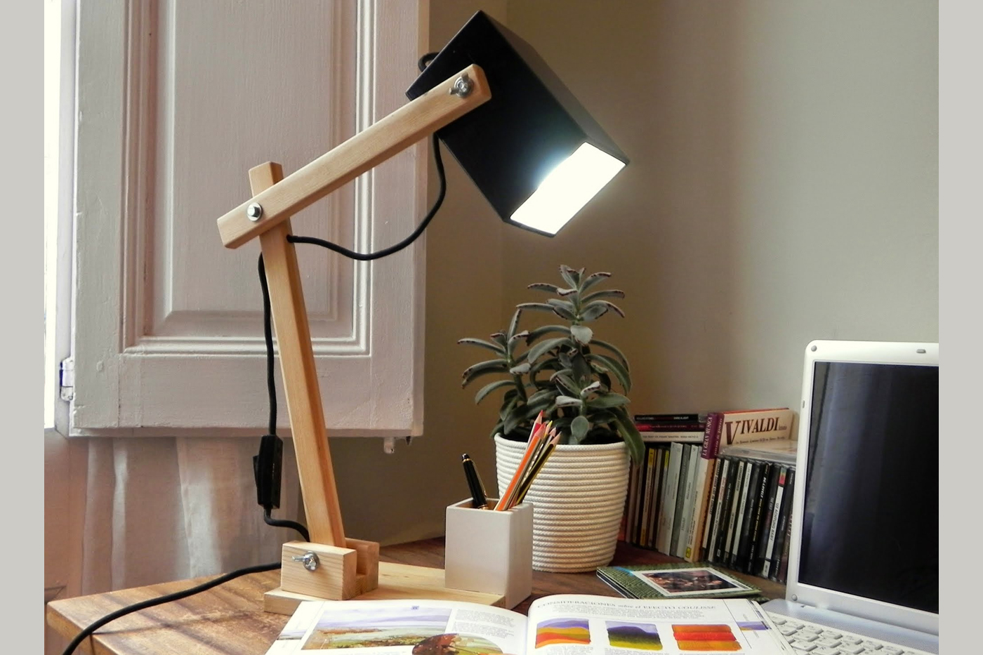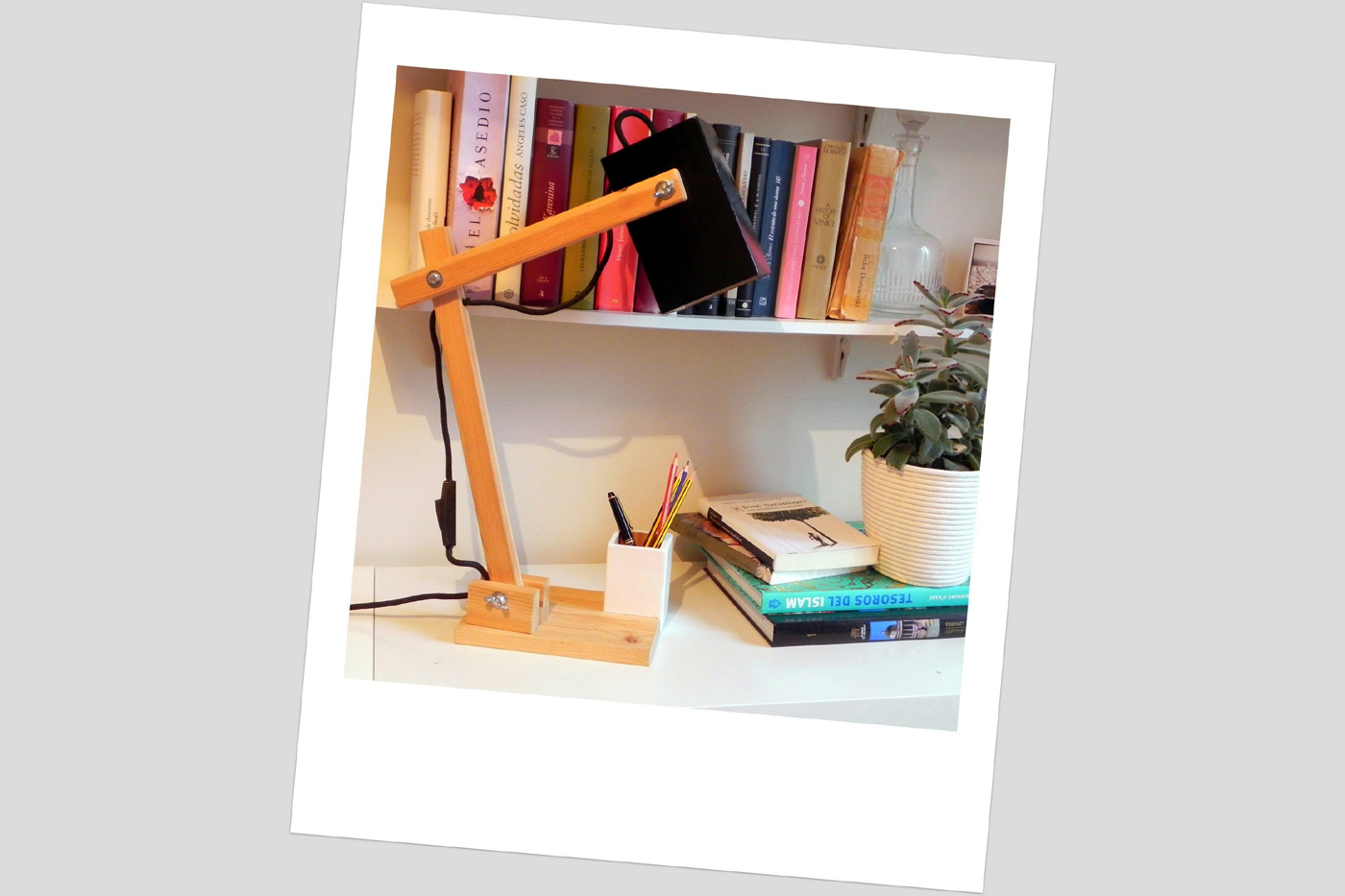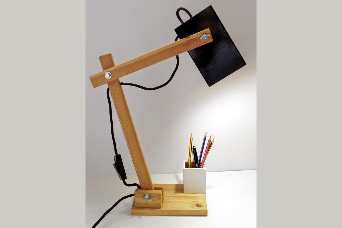 Versionando un clásico del diseño en el mundo de la decoración surgió ésta divertida y elegante lámpara de mesa. Pensamos que necesitaba un pequeño lavado de cara y mejoras en su funcionalidad, así que le proporcionamos una pantalla más recta y esbelta, así como un práctico y divertido portalápices.