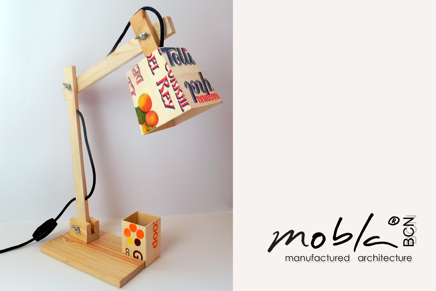 Lámparas de mesa con madera reciclada de palé y cajas de fruta, las encontraras en dos versiones, con pie giratorio o fijo, pantalla rectangular o inclinada, y la posibilidad de incorporar o no, un práctico portalápices.