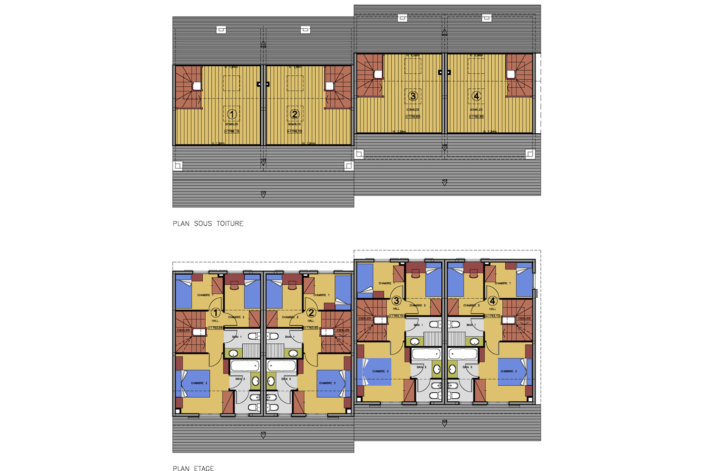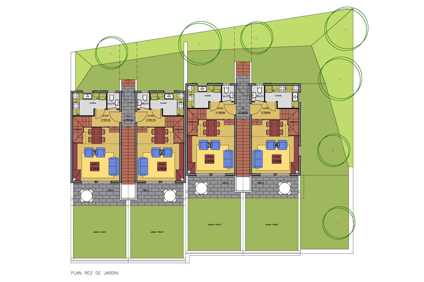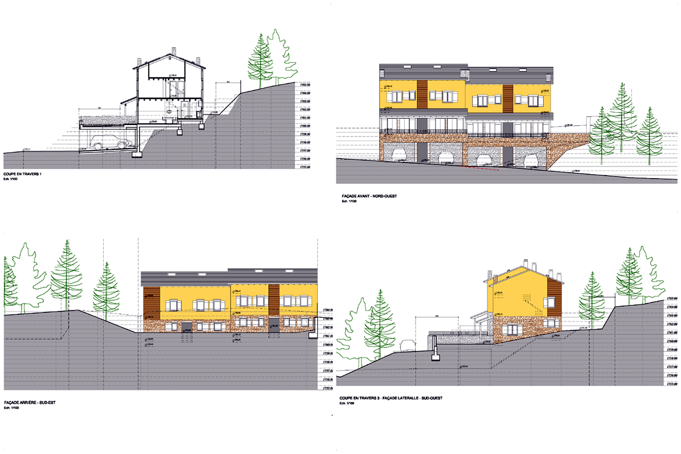 Ubicado en la Cerdaña francesa, se nos encargó un pequeño conjunto de 4 viviendas unifamiliares adosadas, situadas a pie de pistas de esquí. Para ello planteamos una construcción ecológica, viviendas realizadas por completo en madera, procedente de Austria, con dos plantas piso y una pequeña golfa habitable. Mientras que el aparcamiento se situaba a nivel de calle protegido por las terrazas ajardinadas de las viviendas.