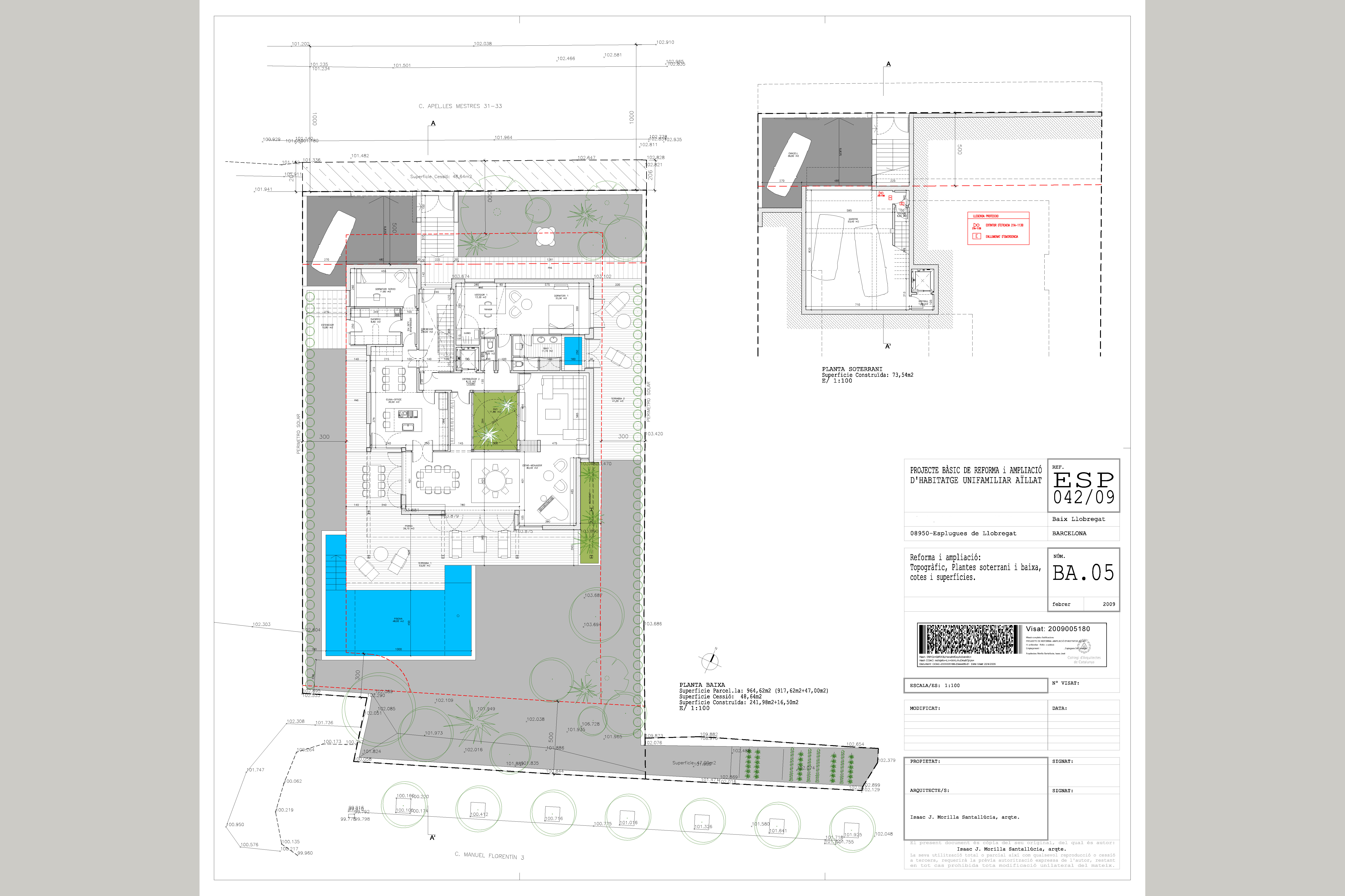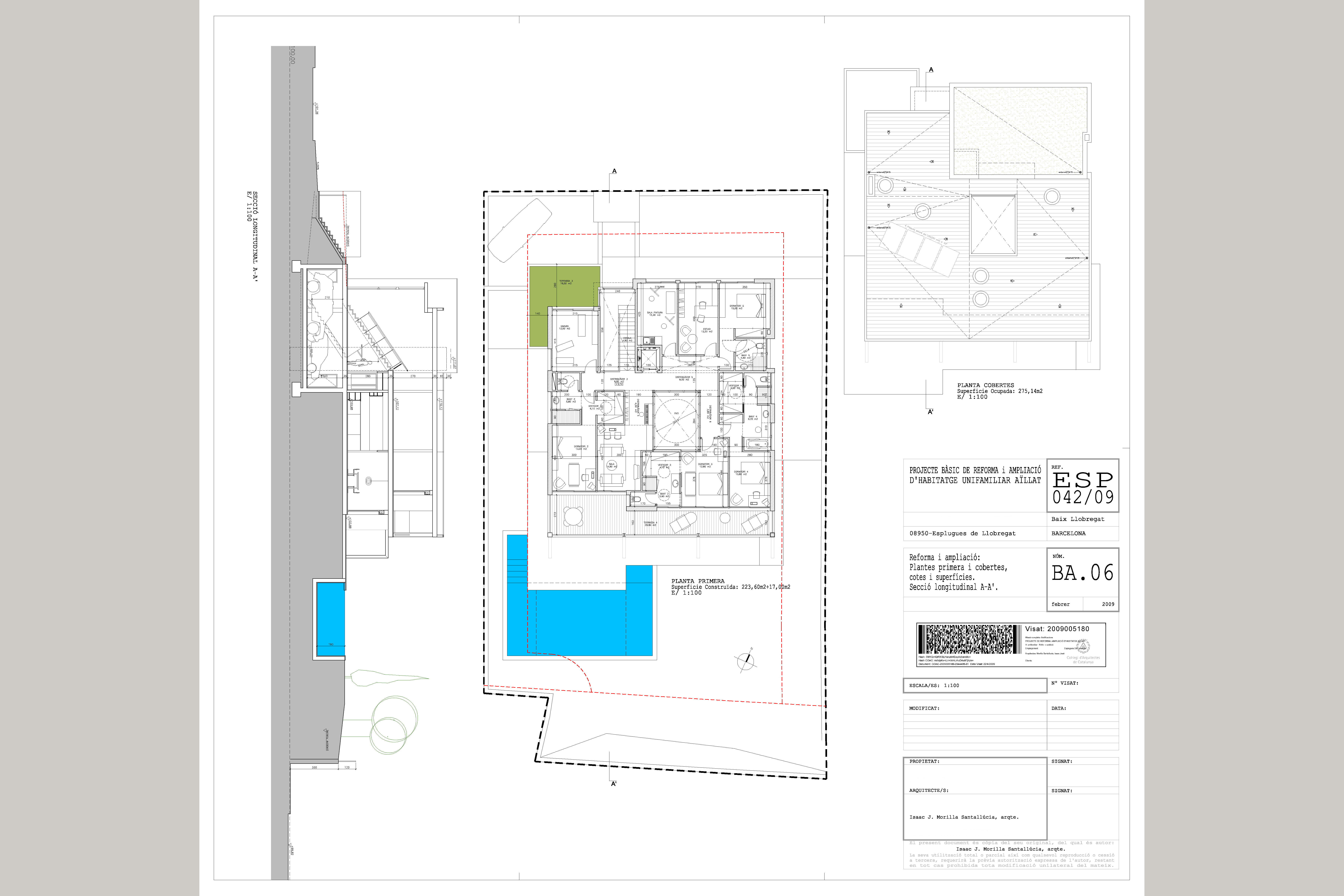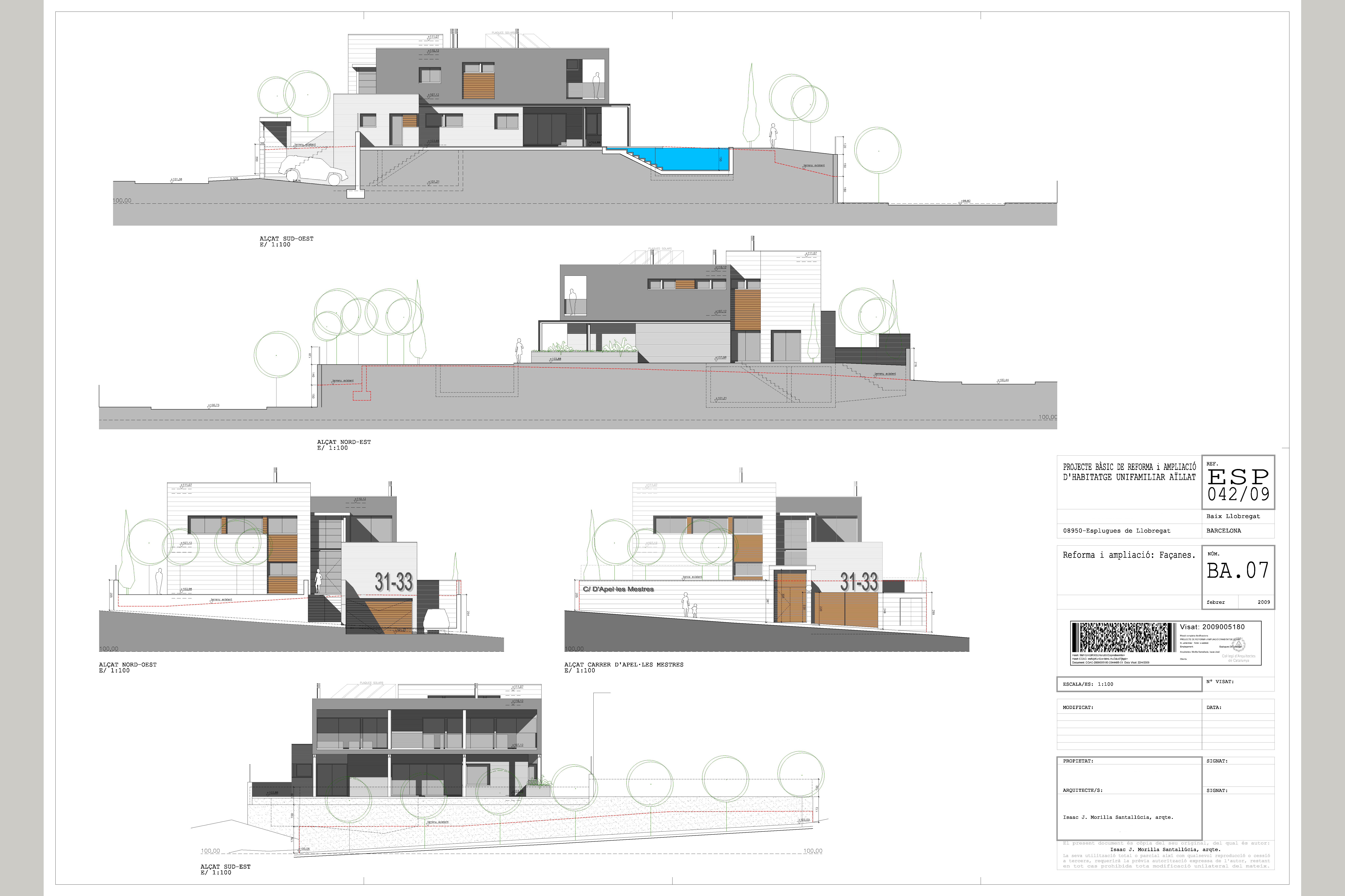 Proyecto de reforma y ampliación de una vivienda unifamiliar en Esplugues de Llobregat, ubicada en un solar de unos 1000 m2 y una construcción existente de 250 m2, se proyectó una remonta de otros 250 m2 así como un sótano para aparcamiento de 3 coches, ascensor, 6 dormitorios en suite, sala de estar con diversos ambientes, una gran cocina y diversas salas de ocio para la familia, todo ello situado alrededor de un patio central que ventilaba y daba luz a gran parte de las estancias de la casa.