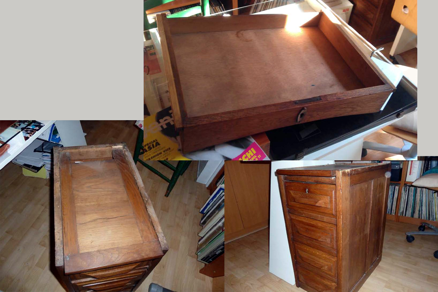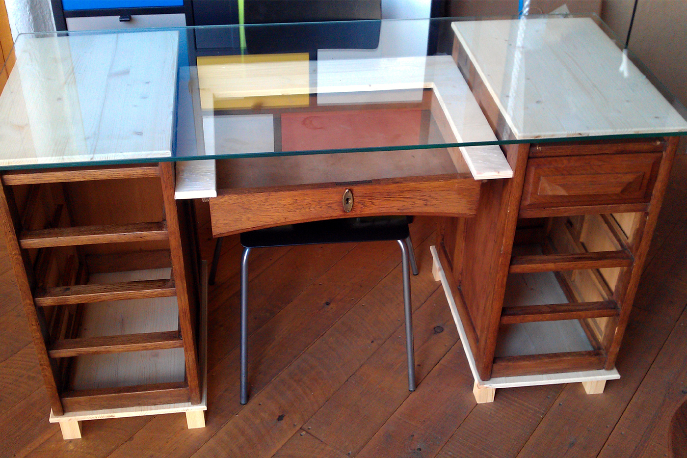 Reconstruir un escritorio en desuso y maltrecho no es una tarea fácil, y más cuando lo que apremia es la economía. Nos propusimos recuperar éste viejo mueble sin grandes alardes técnicos, para ello recompusimos las partes que no teníamos con madera de pino teñida en roble. El resultado, fue éste original y moderno escritorio, que seguro nada tiene que ver son su apariencia original pero que le dota de ese aire austero y sin duda moderno y atrevido a la vez.