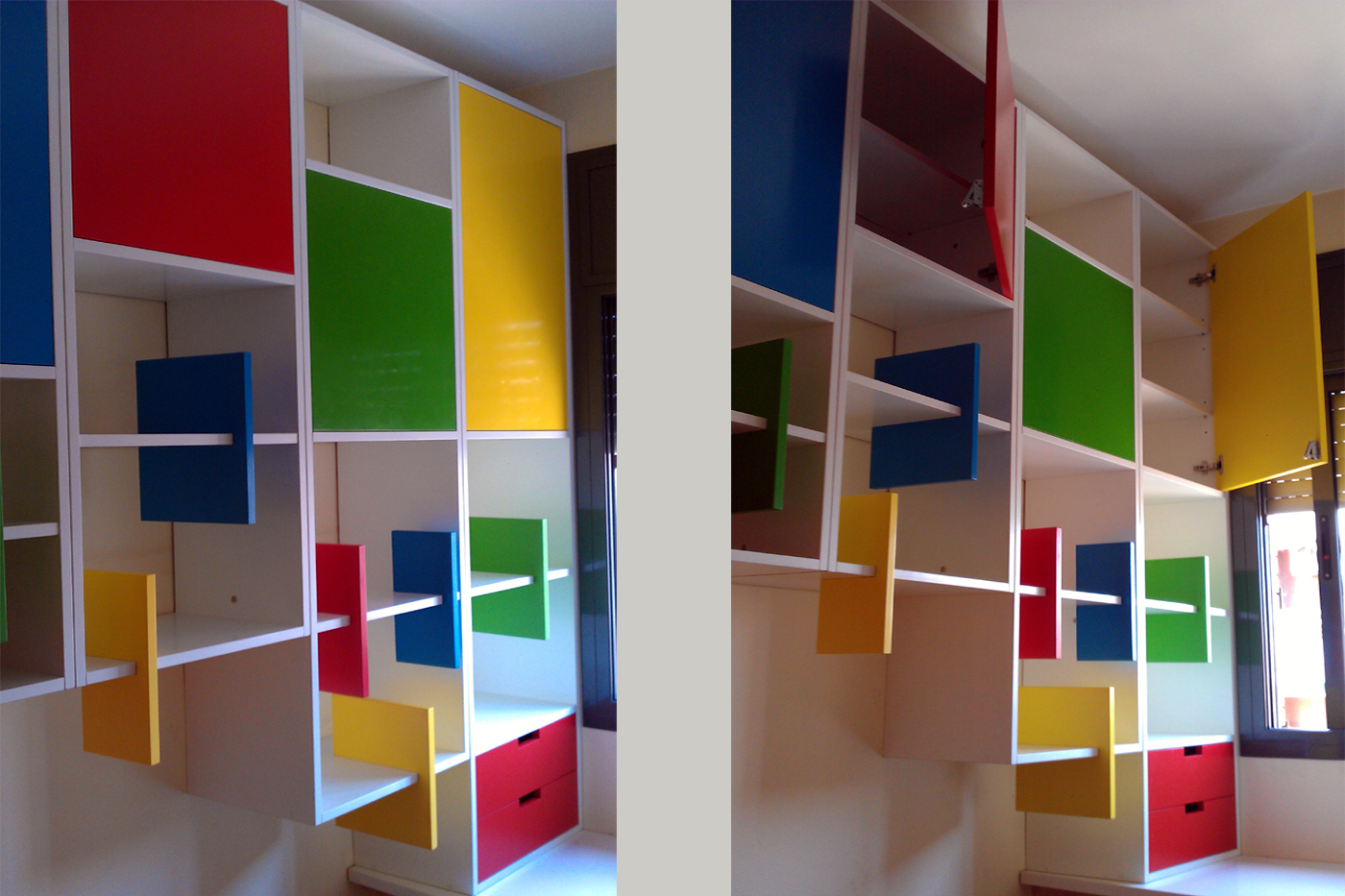 Colorido y funcional mueble para habitación infantil. Compuesto de diversos módulos verticales desalineados que se desencajan para ubicar debajo la cama del dormitorio, y ésta, a su vez, se coloca justo por debajo del tablero que conforma el escritorio de la zona de trabajo. Decorado con vivos colores sobre estructura blanca, las puertas carecen de tirador y diseñamos unos exclusivos sujeta libros móviles, también en vivos colores, que permiten sujetar a la vez los libros tanto de la estantería superior como de la inferior.