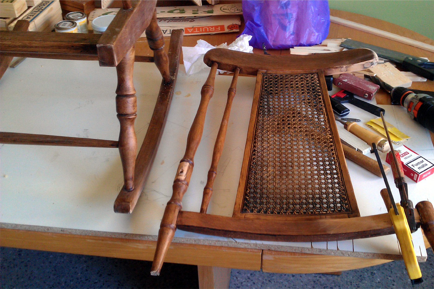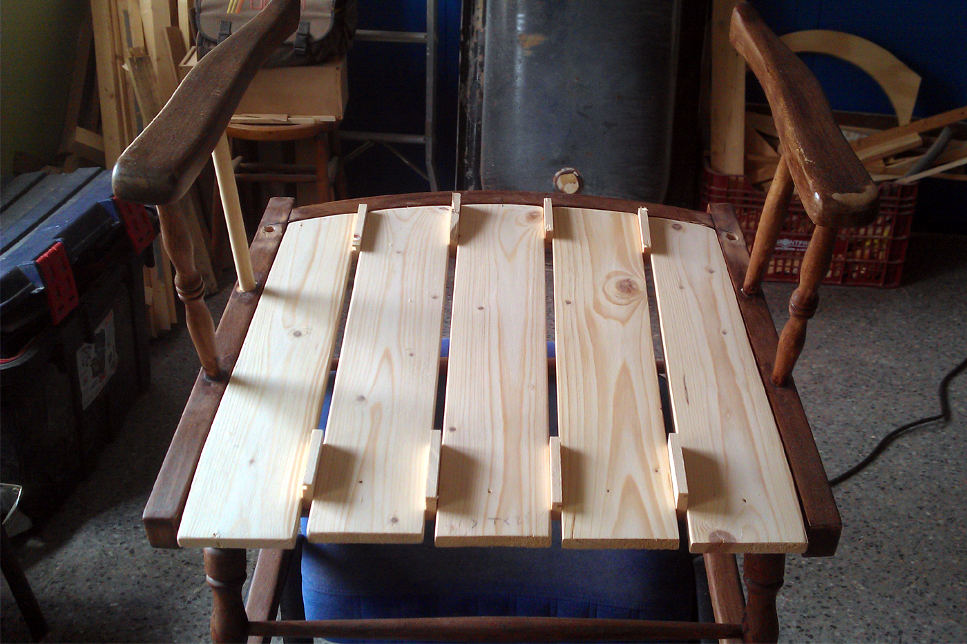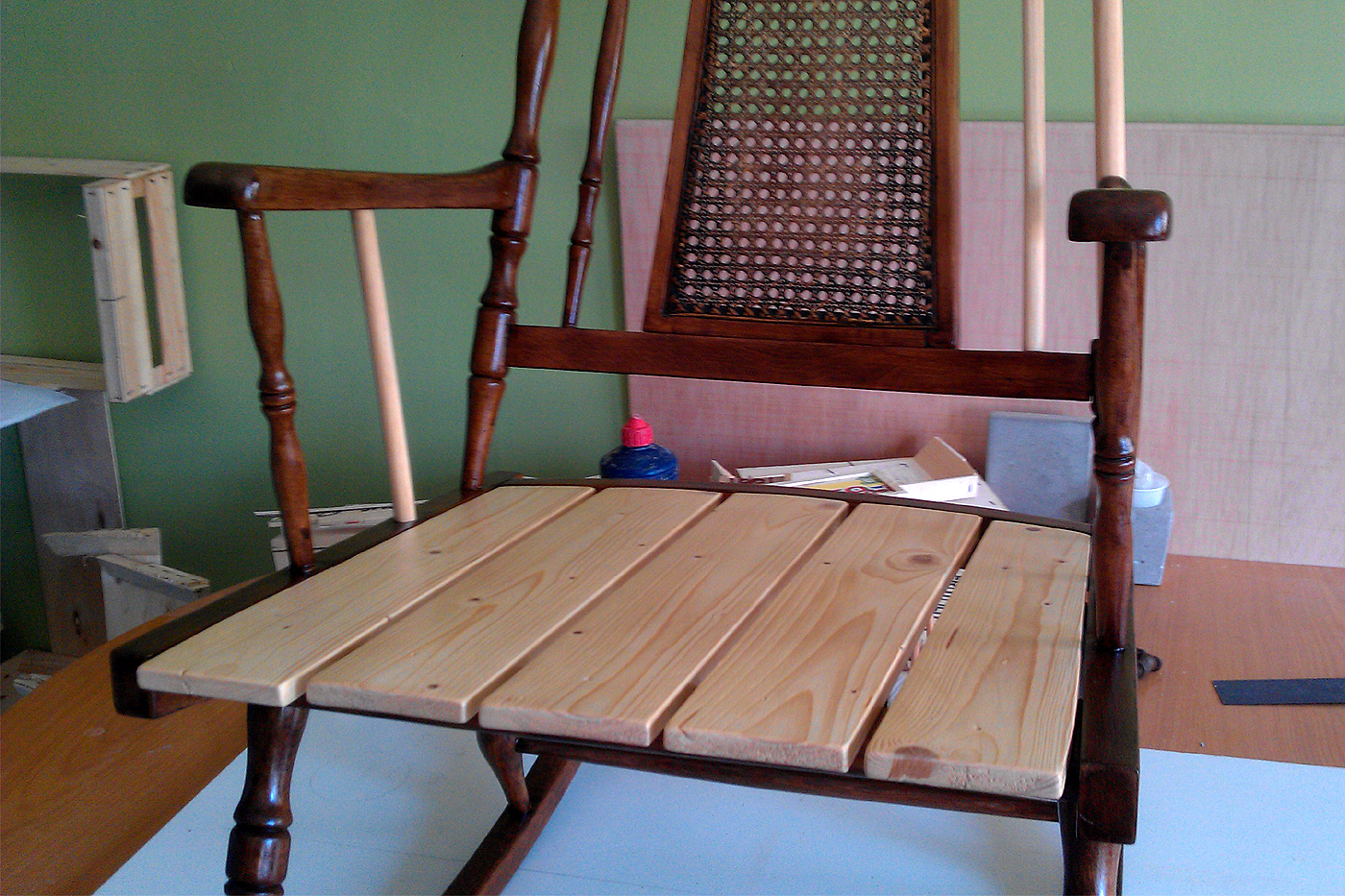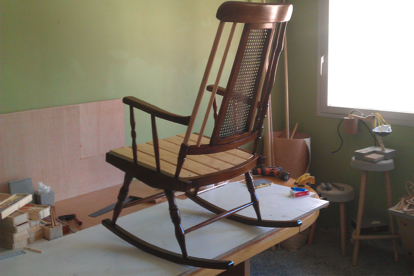 Mecedora desechada y descompuesta que todos podemos encontrar en la calle; el reto era, no ya devolverla a su estado original, sino dejar patentes las huellas de su accidentada vida. Nos pusimos manos a la obra y recompusimos la silla con materiales claramente ajenos a ella. Creemos que el resultado valió la pena; una atrevida y atípica restauración donde se puede apreciar claramente el original y divertido trabajo realizado en ella.