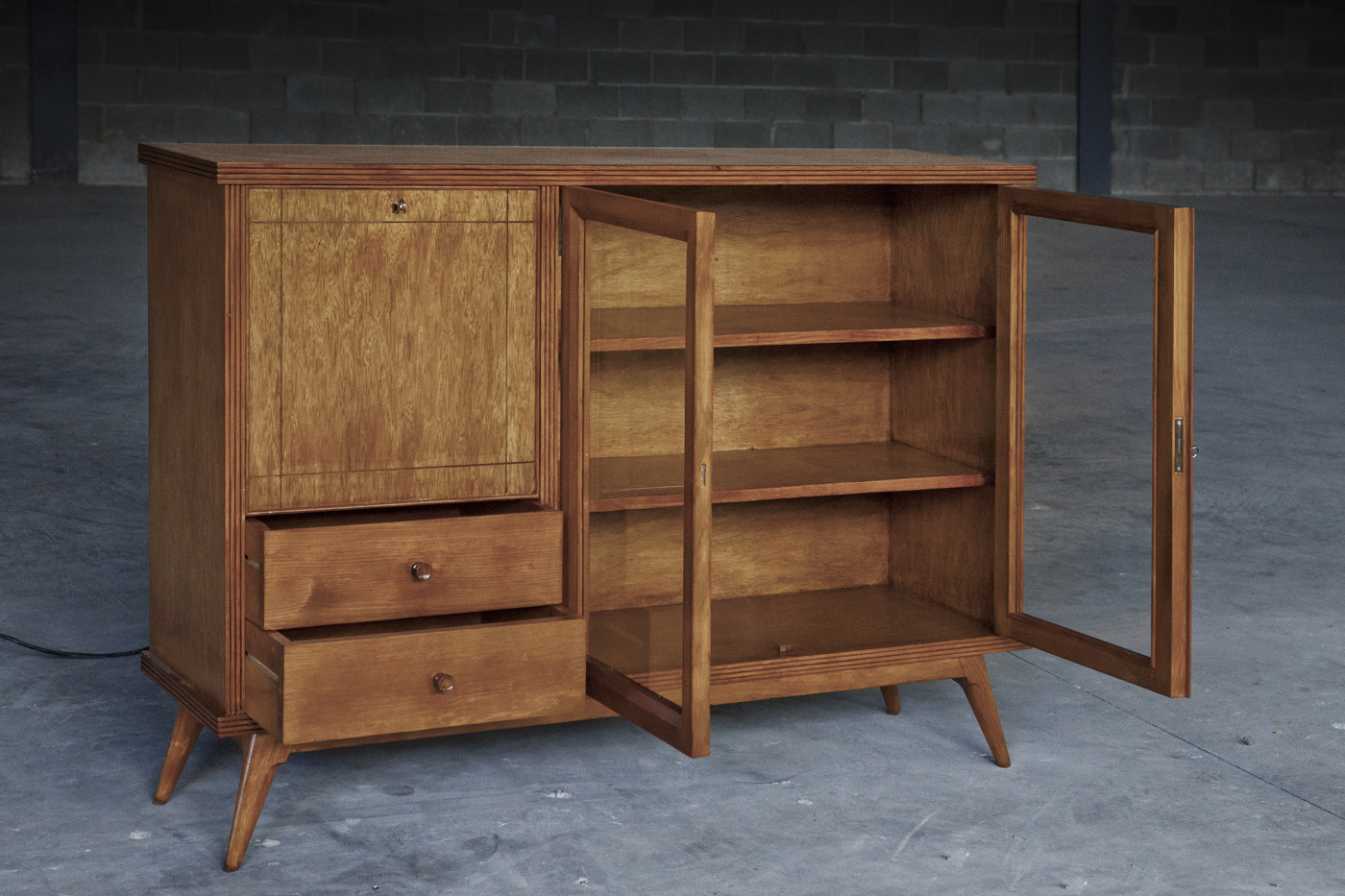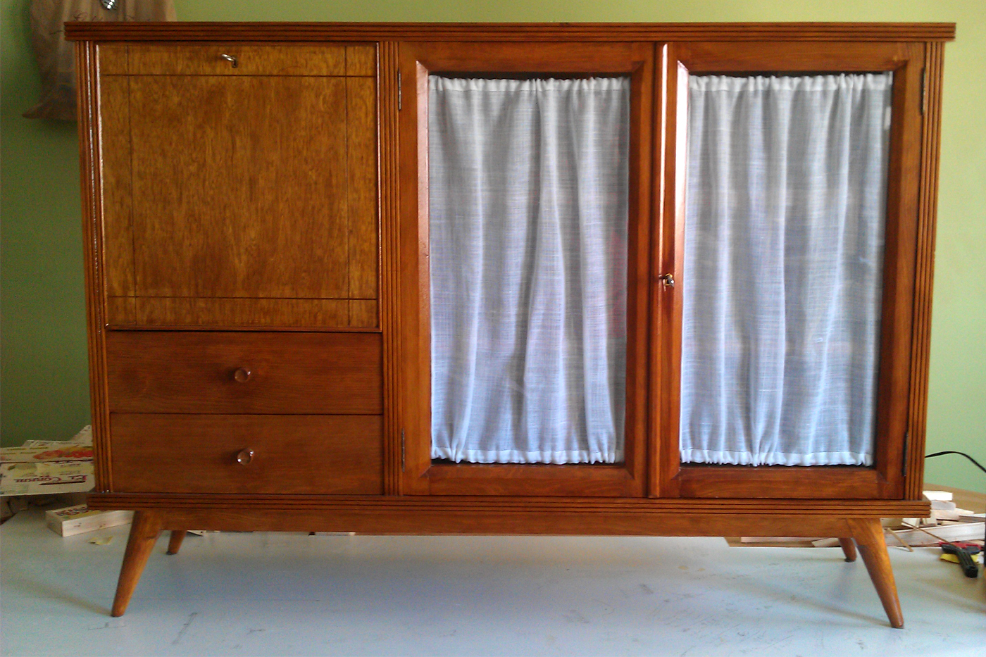 Un mueble recuperado de la calle da para mucho…… y más cuando le dedicas unas cuantas horas de trabajo y esfuerzo. Lijado a conciencia, recuperando cristales, junquillos, etc…, y un buen teñido y barnizado te lo dejan como nuevo. Y si además le recuperas los espejos e incorporas luces led al mueble bar, obtienes sin duda una pequeña obra de arte y por poco dinero un mueble bar con un aire aún más retro !!